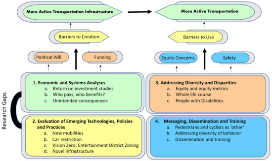 Expanding infrastructure and improving safety for diverse users depends critically on understanding attitudes and the diversity of transportation behaviors and needs. Cross-cutting issues frequently mentioned included attention to intersections of AT with planning and housing sectors, more rigorous evaluation of natural experiments, and efforts to understand unintended consequences of policies and programs. Progress in rigorous evaluation and understanding unintended consequences was seen to depend on better data, coordinated and complementary funding from both the health and transportation sectors, and dissemination of evidence and training across disciplines—with special attention to trainees of underrepresented groups.