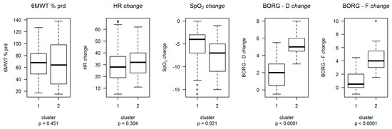 Through unsupervised analysis it was possible to identify two clusters: Cluster 1 (C1) included 133 participants (86.4%), and Cluster 2 (C2) included the remaining 21 (13.6%). Compared to C1, the individuals in C2 showed a larger increase in Borg-F and Borg-D and a greater reduction in SpO2 (Figure 2 and Table 2).