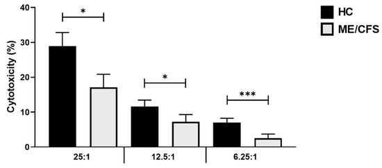 The baseline NKCCA at the E:T of 25:1 for HCs was 28.94 ± 3.893 and 17.13 ± 3.721 for ME/CFS patients, respectively (p < 0.05); at 12.5:1 for HCs was 11.65 ± 1.821 and 7.19 ± 2.120 for ME/CFS patients, respectively (p < 0.05); and at 6.25:1 for HCs was 7.0 ± 1.260 and 2.524 ± 1.182 for ME/CFS patients, respectively (p < 0.001) (Figure 1). At baseline, NK cell cytotoxicity was significantly reduced in the ME/CFS cohort compared with the HC cohort for all E:Ts (25:1, 12.5:1, 6.25:1).