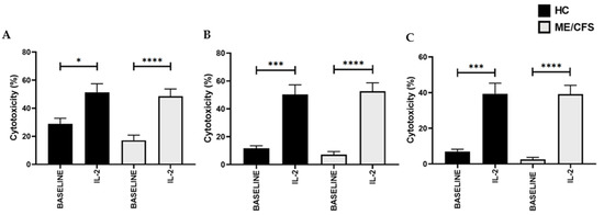 NK cell cytotoxicity at baseline compared with post-IL-2 stimulation; n = 17 for HC and n = 17 for ME/CFS. (A) 25:1 ratio (B) 12.5:1 ratio (C) 12.5:1 ratio. A significantly higher NKCCA was observed in both HCs and ME/CFS patients following IL-2 (20 IU/mL) stimulation compared with that at baseline for each effector to target ratio. Data are represented as the mean ± SEM as determined by independent Mann-Whitney U tests. * p < 0.05, *** p < 0.001, **** p < 0.0001. Abbreviations: healthy controls (HCs), interleukin-2 (IL-2), myelogenous leukemia target cell line (K562), myalgic encephalomyelitis/chronic fatigue syndrome (ME/CFS), natural killer (NK), natural killer cell cytotoxic activity (NKCAA).
