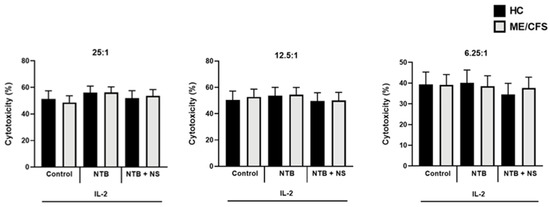 NK cell cytotoxicity post-IL-2 stimulation compared with TRPM7 drug treatments in HC vs. ME/CFS; n = 17 for HC and n = 17 for ME/CFS. After IL-2 (20 IU/mL) stimulation and TRPM7 agonist (20 IU/mL IL-2 + 25 µM NTB) or antagonist (20 IU/mL IL-2 + 25 µM NTB + 10 µM NS8593) treatments for 24 h, no significant differences were observed within or between groups for each condition for any effector to target ratio. Data are represented as the mean ± SEM as determined by independent Mann-Whitney U tests. Abbreviations: healthy controls (HCs), interleukin-2 (IL-2), myelogenous leukemia target cell line (K562), myalgic encephalomyelitis/chronic fatigue syndrome (ME/CFS), natural killer (NK), NS8593 (NS), naltriben (NTB).