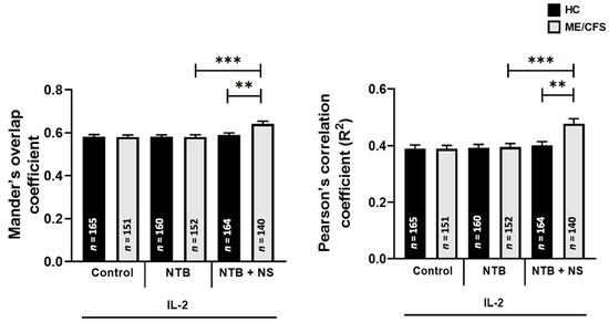 No significant differences were observed for the co-localization of TRPM7 with actin following IL-2 (20 IU/mL) stimulation and treatment with the TRPM7 agonist (20 IU/mL IL-2 + 25 µM NTB) within or between groups. A significant difference between the TRPM7 agonist (20 IU/mL IL-2 + 25 µM NTB) and TRPM7 antagonist (20 IU/mL IL-2 + 25 µM NTB + 10 µM NS8593) treatments was observed within the ME/CFS cohort (p < 0.001) specifically showing an increase in TRPM7 co-localization with actin with TRPM7 antagonism. Additionally, the ME/CFS cohort showed a significant increase in TRPM7 co-localization with actin for the TRPM7 antagonism treatment compared with HCs (p < 0.01) (Figure 4).