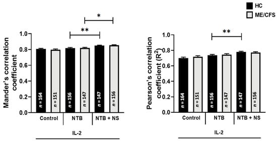 No significant differences were observed for the co-localization of TRPM7 with PIP2 following IL-2 (20 IU/mL) stimulation and treatment with the TRPM7 agonist (20 IU/mL IL-2 + 25 µM NTB) within or between groups. A significant difference between the TRPM7 agonist (20 IU/mL IL-2 + 25 µM NTB) and TRPM7 antagonist (20 IU/mL IL-2 + 25 µM NTB + 10 µM NS8593) treatments was observed within the HC cohort (p < 0.01) and ME/CFS cohort (p < 0.05) specifically showing an increase in TRPM7 co-localization with PIP2 with TRPM7 antagonism (Figure 5).
