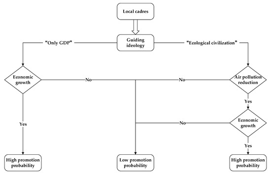 To vividly illustrate two different types of promotion logic, we draw Figure 1 as follows. In the past, the traditional guiding ideology of a political promotion tournament was “only GDP”, that is, local cadres with better economic performance are more likely to be promoted while the opposite will face a lower promotion probability [16,17,18]. Since the announcement of ecological civilization, a new model of political promotion tournament was proposed and air pollution reduction (or environmental performance) had priority over economic growth, that is, only those who meet the environmental criteria firstly and achieve rapid economic growth simultaneously are more likely to be promoted [19,20,21,22,23]. Against this institutional reform, local cadres will have enough impetus in developing the economy and protecting the environment at the same time to achieve the win–win of an economy–environment balance.