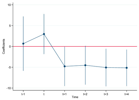 Before implementing the regression, two diagnostic tests including the parallel trend test [25] and the placebo test [3,26] have been conducted to guarantee the suitability and reliability of the DID model. Taking AQI, for example, the results for those two tests are shown in Figure 2 and Figure 3, respectively. It is clear that the parallel trend test and the placebo test are satisfied, thus the DID model is suitable for this study. Similarly, those two tests are also satisfied for other air pollutants.