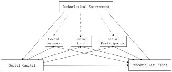 The Chinese government implemented a plan, the Outline of the Strategy for Digital Rural Development in 2019, to accelerate the development of broadband communication networks, mobile internet accessibility, digital television networks, and next-generation internet in rural areas. At present, the value of rural digitalization construction has found its way into COVID-19 prevention and control. For example, information technology plays an important role in identifying infection sources, predicting disease spread, and remote diagnosis. As a result, the era of public health emergency prevention and control, led by information technology, has arrived [12]. Some researchers have analyzed the application of Health Code technology. By tracking the trajectory of population flow through Health Code, technology companies can monitor population control, improve the government’s grassroots governance ability, and realize technological empowerment [13]. However, the role of digital rural construction in rural pandemic prevention and control has not received sufficient attention in theoretical research. Therefore, this research intends to establish a model to explore the influence of social capital and technological empowerment on pandemic resilience in rural areas, and to discuss the mediating effect of social capital between technological empowerment and pandemic resilience.