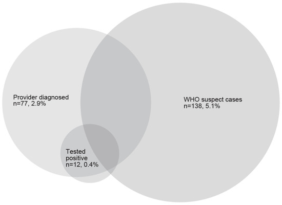Respondents provided data on 2694 children, of whom 185 (6.9%) met at least one case definition: 138 (5.1%) met WHO suspect case criteria, 77 (2.9%) were told by a healthcare provider that they had or might have had COVID-19, and 12 (0.4%) tested positive, either by RT-PCR or serology. There was overlap among the three groups: for example, among the 138 children who met WHO suspect case criteria based on reported symptoms, 30 (21.7%) were also diagnosed by a healthcare provider; among the 77 children diagnosed by a healthcare provider, 11 (14.3%) tested positive; and four children met all three case definitions (Figure 2).