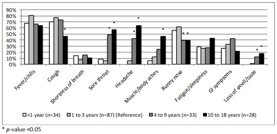 Among children with suspected or diagnosed COVID-19 (n = 185), the most prevalent symptoms were fever or chills (>60% of children from all age groups) and cough, while the least prevalent symptoms were shortness of breath and loss of smell or taste (<20% of children for each). Children age 10–18 years were less likely to experience cough than 1–3 year olds (46% versus 77%) and more likely to experience muscle/body aches (46% versus 13%). Although not statistically significant, possibly due to small sample size, a higher percentage of children age 10–18 years also experienced fatigue or sleepiness compared to younger children. School-age children (4–18 years) were more likely to experience sore throat, headache, and loss of smell or taste than 1–3 year olds, and less likely to experience runny nose (Figure 3). Fourteen of the children who met one of the three case definitions in our cohort (7.6%) were asymptomatic: none of those classified as WHO suspect cases, 13 (16.9%) of those diagnosed by a healthcare provider, and 3 (25.0%) of those who tested positive (data not shown).