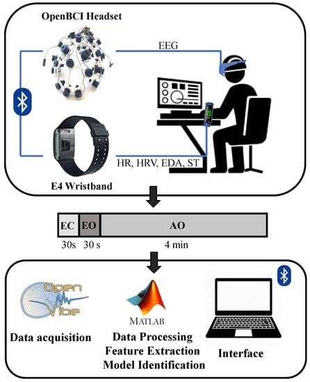 The AO task was formed by the presentation of a total of 120 auditory stimuli of two classes (two different tones): 96 frequent and 24 non-frequent stimuli, with a 80:20 probability proportion, as suggested in [53,61]. Stimuli were presented for one second, with an inter-stimulus period of one second. Volunteers were instructed to use a set of earphones during the recordings to avoid distractions from surrounding noise. Participants underwent one trial each of the explained protocol. Stimulus presentation protocols were designed using OpenVibe software, which allows real-time acquisition, filtering, processing, classifications and visualization of brain signals [62]. Data from the E4 wristband were stored in a cloud server and accessed using the E4 Manager app. MATLAB was used for offline processing of the obtained data, feature extraction and model evaluation.