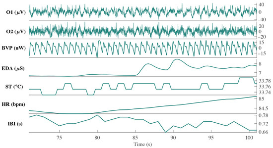 The Empatica E4 wristband is a wireless wearable system that measures biometric signals in real time [65]. This system measures PPG, inter-beat interval (IBI), HR, EDA and skin temperature (ST) signals. Signals were obtained at 64 Hz (PPG), 4 Hz (EDA and ST) and 1 Hz (HR and IBI). The last five rows of Figure 2 show a 30 s visualization of signals (BVP, EDA, ST, HR and IBI) of one representative participant.