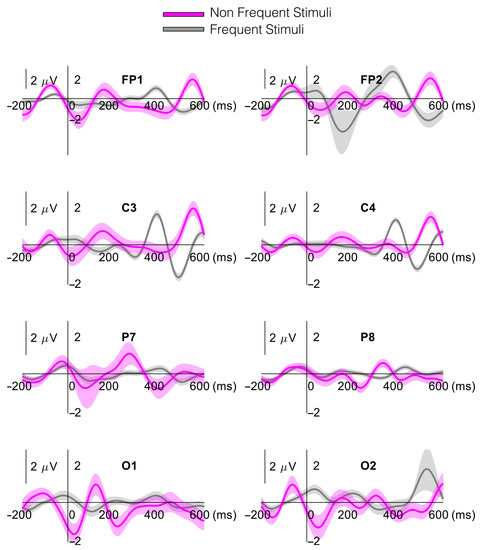 Figure 4 shows a P300 waveform representation obtained from the average of all subjects for both frequent and non-frequent stimuli during the AO trial at eight channels. In this representation, the P300 wave is observed around 200 ms after stimulus onset at FP1 and C3, and more prominently at 300 ms in P7.