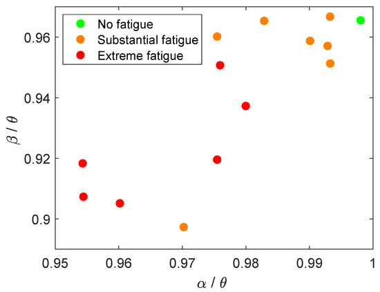 Due to the fact that Spanish was the first language of all volunteers, the Spanish version of the FAS was used in this study [70]. The FAS questionnaire consists of 10 questions with an individual score (1–5). The questions and possible answers from the FAS are presented in Figure S1 (see Supplemental Material). According to [71], the FAS total score can be classified into three classes: no fatigue (1–21), substantial fatigue (22–35) and extreme fatigue (36–50). From the 17 participants, 3 were in the no fatigue class (19 ± 2), 8 in substantial fatigue (27 ± 3), and 6 (37 ± 3) in extreme fatigue. A distribution plot of the FAS scores of the 17 participants is presented in Figure S2 (see Supplemental Material).