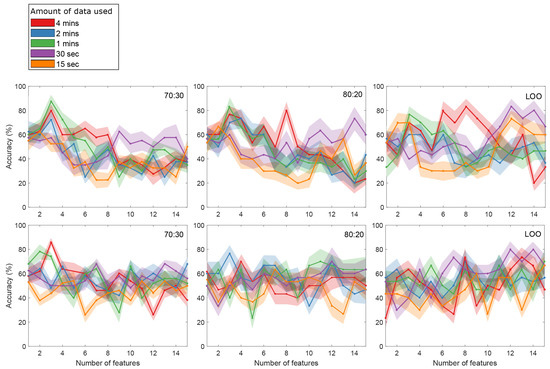 Average classification accuracies for the EEG (top row) and NR-EEG models (bottom row) ( features), using 4 min, 2 min, 1 min, 30 s and 15 s of data during the AO task. Shaded area represents standard error across cross-validations. Model performance was evaluated using 70:30 (left), 80:20 (middle) and LOO (right) data splitting approaches.