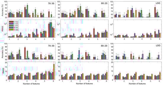 The accuracies and RMSEs from both EEG and NR-EEG models in the three data ratios are presented in Figure 7, using different amounts of data points in the AO tasks. It is observed that the highest accuracy classifier () also presents the lowest RMSE value of . In the 80:20 and LOO approaches, in general for the first six features, the accuracies are lower and the errors higher than in the most accurate 70:30 model.