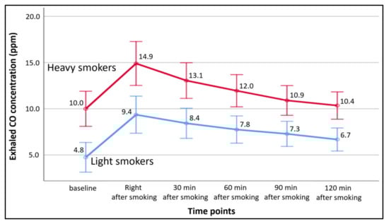 Figure 1 presents the exhaled CO concentration for light smokers and heavy smokers at different time points. The average exhaled CO concentrations changed following the same pattern in both smoking groups (light smokers and heavy smokers) through the time points, and heavy smokers had a higher exhaled CO concentration than light smokers at all time points.