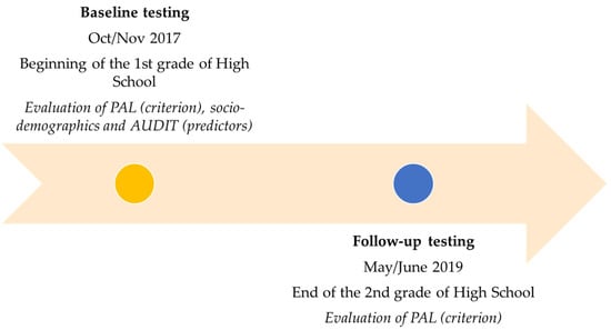 Data were collected through previously validated questionnaires that included (i) sociodemographic variables and sports participation, (ii) data on alcohol consumption, and (iii) estimation of PALs [,,]. Sociodemographic factors, sports participation, and alcohol consumption were evaluated at baseline, while PAL was estimated in both testing waves (Figure 1)