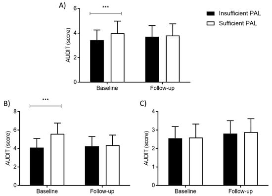 Figure 2 presents the descriptive statistics and differences in AUDIT scores between groups based on sufficiency/insufficiency of PAL at baseline and follow-up. At baseline, adolescents with a higher AUDIT score were more likely to be sufficiently physically active (Figure 2A). However, when calculations of differences were stratified by gender, the differences reached statistical significance only for boys (Figure 2B), and not for girls (Figure 2C).