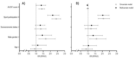 At the univariate level, male gender, sports participation, and AUDIT score were significantly associated with PAL at baseline. Specifically, a higher likelihood for achieving an appropriate PAL was found for boys (OR = 1.68, 95%CI: 1.20–2.34), adolescents who participated in sports (OR = 2.41, 95%CI: 2.11–2.73), and adolescents who had higher scores on the AUDIT scale (OR = 1.41, 95%CI: 1.20–1.61). The Hosmer–Lemeshow test confirmed the appropriateness of the model fit (χ2 = 1.24–4.57, p > 0.05). The significance of the univariate predictors was confirmed even in the multivariate logistic regression calculation (ORs = 1.44, 2.17, and 1.37 and 95%CIs: 1.02–2.09, 1.81–2.61, and 1.01–1.68 for male gender, sports participation, and AUDIT score, respectively) (Figure 3A).