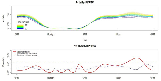 Functional Linear Modeling (FLM [19]), a statistical framework specifically developed for the analysis of data acquired through actigraphy, was used to examine the variation in the 24 h motor activity pattern according to the PPASC total score. The raw 24 h motor activity pattern is replaced with a function by applying the Fourier expansion model and is then analyzed through a non-parametric permutation F-test to ascertain a significant association between motor activity levels and PPASC total score.