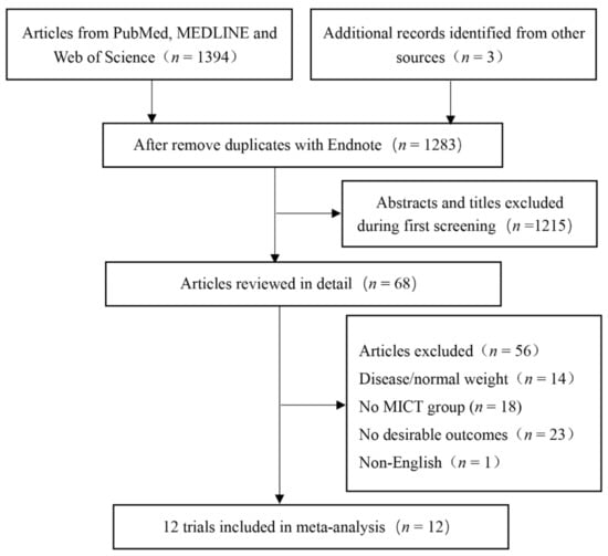 Through electronic data retrieval, 1397 articles were found and 114 duplicate articles were excluded. Subsequently, 1215 studies inconsistent with the topics were excluded. In total, the full text of 68 studies were evaluated, and 56 studies were excluded due to the following reasons: disease/normal weight (n = 14), no MICT group (n = 18), no desirable outcomes (n = 23), and non-English (n = 1). After evaluation, we conducted a final meta-analysis of 12 RCTs that met the inclusion and exclusion criteria (Figure 1). The program characteristics for HIIT and MICT interventions are summarized in Table 1.