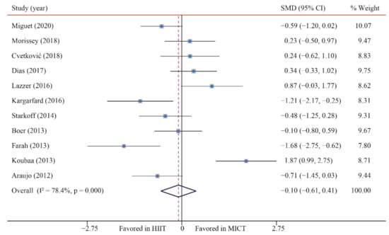 According to the data of 11 trials that examined the effect of HIIT vs. MICT on BM, when compared with MICT, there were no significant differences due to HIIT on BM (SMD: −0.10; 95% CI: −0.61 to 0.41; p = 0.705; Figure 2). In addition, there was a high heterogeneity in the weight (I2 = 78.4%; p = 0.000). The sensitivity analysis was conducted by excluding each test in sequence, and the results were robust, indicating that there was no significant difference. No significant publication bias for weight was detected (p-value for Egger: 0.965; p-value for Begg: 0.644) (Supplementary Figures S1–S26).
