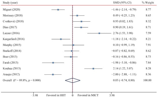 According to the data of 12 trials that examined the effect of HIIT vs. MICT on BMI, no significant difference between HIIT and MICT for BMI was observed (SMD: 0.03; 95% CI: −0.75 to 0.80; p = 0.949; Figure 3). Moreover, high heterogeneity was detected for weight (I2 = 89.8%; p = 0.000). The sensitivity analysis was conducted by excluding each test in sequence, and the results were robust, indicating that there was no significant difference. No significant publication bias for weight was detected (p-value for Egger: 0.611; p-value for Begg: 0.537) (Supplementary Figures S1–S26).