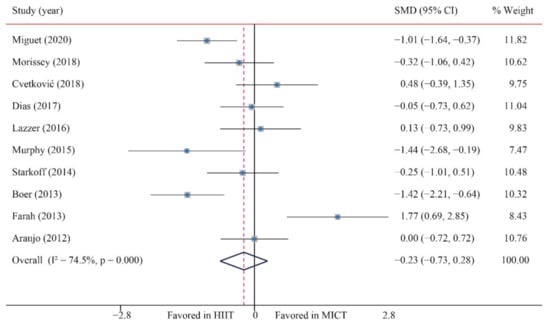 According to the data of 10 trials that examined the effect of HIIT vs. MICT on BF%, no significant difference between HIIT and MICT for BF% was observed (SMD: −0.23; 95% CI: −0.73 to 0.28; p = 0.380; Figure 4). Moreover, moderate heterogeneity was detected for weight (I2 = 74.5%; p = 0.000). The sensitivity analysis was conducted by excluding each test in sequence, and the results were robust, indicating that there was no significant difference. No significant publication bias for weight was detected (p-value for Egger: 0.437; p-value for Begg: 0.283) (Supplementary Figures S1–S26).