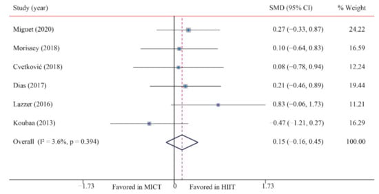 The data of six trials were examined regarding the effect of HIIT and MICT on FFM; no significant difference between MICT and HIIT on FFM was found (SMD: 0.15; 95% CI: −0.16 to 0.45; p = 0.338; Figure 5). Moreover, low heterogeneity was detected for weight (I2 = 3.6%; p = 0.394). The sensitivity analysis was conducted by excluding each test in sequence, and the results were robust, indicating that there was no significant difference. No significant publication bias for weight was detected (p-value for Egger: 0.735; p-value for Begg: 0.707) (Supplementary Figures S1–S26).