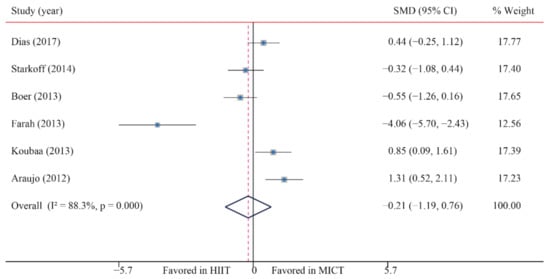 The data of six trials were examined regarding the effect of HIIT vs. MICT on AF; no significant difference between HIIT and MICT for AF was observed (SMD: −0.21; 95% CI: −1.19 to 0.76; p = 0.670; Figure 6). Moreover, high heterogeneity was detected for weight (I2 = 88.3%; p = 0.000). The sensitivity analysis was conducted by excluding each test in sequence, and the results were robust, indicating that there was no significant difference. No significant publication bias for weight was found (p-value for Egger: 0.124; p-value for Begg: 1.000) (Supplementary Figures S1–S26).