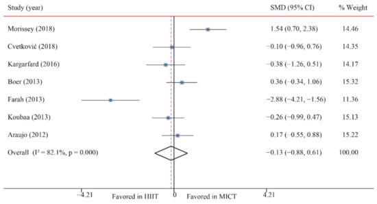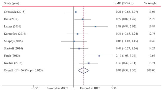Eight trials were examined regarding the effect of HIIT vs. MICT on CRF (VO2max); HIIT’s significantly greater effects on VO2max compared with MICT were observed (SMD: 0.87; 95% CI: 0.39 to 1.35; p = 0.000; Figure 7). Moreover, moderate heterogeneity was detected for weight (I2 = 56.8%; p = 0.023). The sensitivity analysis was conducted by excluding each test in sequence, and the results were robust, indicating that there was no significant difference. No significant publication bias for weight was detected (p-value for Egger: 0.377; p-value for Begg: 0.711) (Supplementary Figures S1–S26).