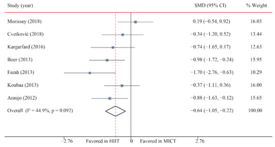 The data of seven trials regarding the effect of HIIT vs. MICT on SBP showed that, when compared with MICT, HIIT significantly decreased SBP (SMD: −0.64; 95% CI: −1.05 to −0.22; p = 0.003; Figure 8). Moreover, low heterogeneity was detected for weight (I2 = 44.9%; p = 0.092). A sensitivity analysis revealed a robust conclusion and showed a non-significant difference by sequentially excluding each trial (Supplementary Figures S1–S26). No significant publication bias for weight was detected (p-value for Egger: 0.192; p-value for Begg: 0.133; Supplementary Figures S16–S26). When the potential publication bias was adjusted by using the trim-and-fill method, the conclusion did not change (SMD: −0.40, 95% CI: −0.68 to −0.13, p = 0.004), and the funnel plot after shearing and supplementation showed no obvious asymmetry, suggesting no publication bias (Supplementary Figures S16–S26).