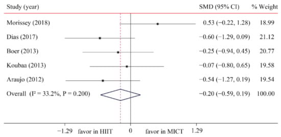 The data of five trials were examined regarding the effect of HIIT vs. MICT on TG; no significant difference between HIIT and MICT was observed for TG (SMD: −0.20; 95% CI: −0.59 to 0.19; p = 0.321; Figure 10). Moreover, low heterogeneity was detected for weight (I2 = 33.2%; p = 0.200). A sensitivity analysis revealed a robust conclusion and showed a non-significant difference by sequentially excluding each trial (Supplementary Figures S1–S26). No significant publication bias for weight was detected (p-value for Egger: 0.198; p-value for Begg: 0.221; Supplementary Figures S16–S26). The funnel plot after shearing and supplementation showed no obvious asymmetry, suggesting no publication bias (Supplementary Figures S16–S26).