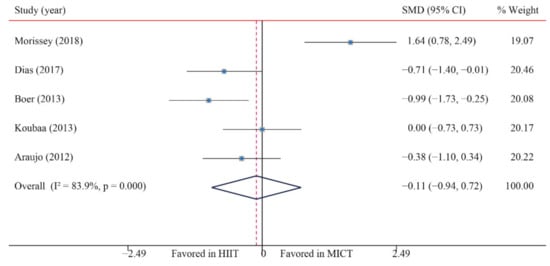 Hypertension (HBP) is one of the main risk factors of cardiovascular disease that is induced by childhood obesity []. Some studies have shown that childhood HBP will develop into adulthood and positively correlates with an increased risk of organ injury, such as coronary artery calcification, heart ventricle hypertrophy and increased carotid intima-media thickness []. Obesity was shown to be the main cause of HBP in children and adolescents. Due to the rapidly increased prevalence of obese children and adolescents in China, the population attributable risk (PAR%) of HBP steadily increased from 6.3% in 1995 to 19.2% in 2014 [,]. Seven studies that were included in our review compared the effects of HIIT versus MICT on blood pressure; the results showed that HIIT significantly improved SBP in obese children and adolescents when compared with MICT, while showing no significant difference for DBP. This is inconsistent with the findings for adults; the results from Batacan [] and Costa [] showed that there was no significant difference between HIIT and MICT regarding improving SBP.