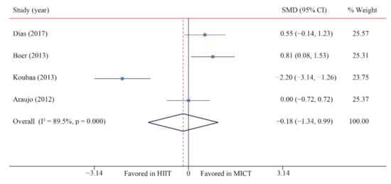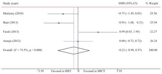 The data of four trials compared the effects of HIIT versus MICT on BI. The analyzed results showed that when compared with MICT, HIIT had no significant effects on BI (SMD: −0.21; 95% CI: −0.99 to 0.57; p = 0.596; Figure 15), and moderate heterogeneity was detected (I2 = 74.5%; p = 0.008). A sensitivity analysis was conducted by excluding each test in sequence, and the results were robust, indicating that there was no significant difference. No significant publication bias was observed for BMI (p-value for Egger: 0.250; p-value for Begg: 0.734) (Supplementary Figures S1–S26).