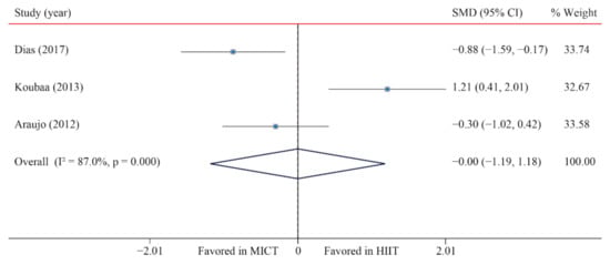 The following are available online at www.mdpi.com/1660-4601/182/21/1905/s1, Figure S1. Sensitivity analysis of high-intensity interval training versus moderate-intensity continuous training on body mass (BM)—HIIT vs. MICT metainf; Figure S2. Sensitivity analysis of high-intensity interval training versus moderate-intensity continuous training on body mass index (BMI)—HIIT vs. MICT metainf.; Figure S3. Sensitivity analysis of high-intensity interval training versus moderate-intensity continuous training on body fat percentage (BF%)—HIIT vs. MICT metainf; Figure S4. Sensitivity analysis of high-intensity interval training versus moderate-intensity continuous training on abdominal fat (AF)—HIIT vs. MICT metainf, Figure S5. Sensitivity analysis of high-intensity interval training versus moderate-intensity continuous training on fat free mass (FFM)—HIIT vs. MICT metainf; Figure S6. Sensitivity analysis of high-intensity interval training versus moderate-intensity continuous training on maximal oxygen uptake (VO2max)—HIIT vs. MICT metainf; Figure S7. Sensitivity analysis of high-intensity interval training versus moderate-intensity continuous training on systolic blood pressure (SBP)—HIIT vs. MICT metainf; Figure S8. Sensitivity analysis of high-intensity interval training versus moderate-intensity continuous training on diastolic blood pressure (DBP)—HIIT vs. MICT metainf; Figure S9. Sensitivity analysis of high-intensity interval training versus moderate-intensity continuous training on blood glucose (BG)—HIIT vs. MICT metainf; Figure S10. Sensitivity analysis of high-intensity interval training versus moderate-intensity continuous training on blood insulin (BI)—HIIT vs. MICT metainf; Figure S11. Sensitivity analysis of high-intensity interval training versus moderate-intensity continuous training on HOMA-IR—HIIT vs. MICT metainf; Figure S12. Sensitivity analysis of high-intensity interval training versus moderate-intensity continuous training on triglycerides (TG)—HIIT vs. MICT metainf; Figure S13. Sensitivity analysis of high-intensity interval training versus moderate-intensity continuous training on total cholesterol (TC)—HIIT vs. MICT metainf; Figure S14. Sensitivity analysis of high-intensity interval training versus moderate-intensity continuous training on high-density lipoprotein cholesterol (HDL-C)—HIIT vs. MICT metainf; Figure S15. Sensitivity analysis of high-intensity interval training versus moderate-intensity continuous training on low-density lipoprotein cholesterol (LDL-C)—HIIT vs. MICT metainf; Figure S16. Funnel plot of high-intensity interval training versus moderate-intensity continuous training on body mass (BM)—HIIT vs. MICT plot and metatrim results; Figure S17. Funnel plot of high-intensity interval training versus moderate-intensity continuous training on body mass index–HIIT vs. MICT plot and metatrim results; Figure S18. Funnel plot of high-intensity interval training versus moderate-intensity continuous. Funnel plot of high-intensity interval training versus moderate-intensity continuous training on fat free mass; Figure S19. Funnel plot of high-intensity interval training versus moderate-intensity continuous. Funnel plot of high-intensity interval training versus moderate-intensity continuous training on maximal oxygen uptake (VO2max)—HIIT vs. MICT plot and metatrim results; Figure S20. Funnel plot of high-intensity interval training versus moderate-intensity continuous. Results of trim and fill method for high-intensity interval training versus moderate-intensity continuous training on systolic blood pressure (SBP)—HIIT vs. MICT plot and metatrim results; Figure S21. Funnel plot of high-intensity interval training versus moderate-intensity continuous. Results of trim and fill method for high-intensity interval training versus moderate-intensity continuous training on diastolic blood pressure (DBP); Figure S22. Funnel plot of high-intensity interval training versus moderate-intensity continuous training on triglycerides (TG)—HIIT vs. MICT plot and metatrim results; Figure S23. Funnel plot of high-intensity interval training versus moderate-intensity continuous. Funnel plot of high-intensity interval training versus moderate-intensity continuous training on high-density lipoprotein cholesterol (HDL); Figure S24. Funnel plot of high-intensity interval training versus moderate-intensity continuous training on low-density lipoprotein cholesterol (LDL)—HIIT vs. MICT plot and metatrim results.; Figure S25. Funnel plot of high-intensity interval training versus moderate-intensity continuous training on blood glucose (BG)—HIIT vs. MICT plot and metatrim results; Figure S26. Funnel plot of high-intensity interval training versus moderate-intensity continuous. Funnel plot of high-intensity interval training versus moderate-intensity continuous training on homeostasis model assessment (HOMA-IR)—HIIT vs. MICT plot and metatrim results.