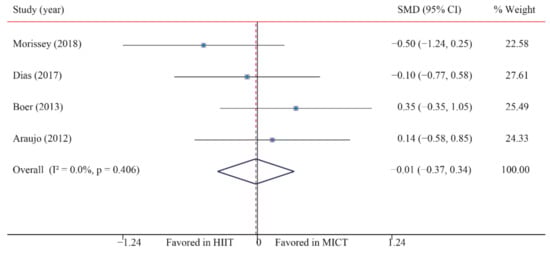 The data of four trials were examined regarding the effect of HIIT versus MICT on BG. The analyzed results suggested that HIIT demonstrated no significant effect on BG when compared with MICT (SMD: −0.02; 95% CI: −0.37 to 0.34; p = 0.935; Figure 14), and low heterogeneity was detected (I2 = 0.0%; p = 0.406). A sensitivity analysis was conducted by excluding each test in sequence, and the results were robust, indicating that there was no significant difference. No significant publication bias was observed for BMI (p-value for Egger: 0.555; p-value for Begg: 0.734) (Supplementary Figures S1–S26).