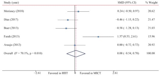 Body composition, especially fat content, is an important index that affects the health of the obese population. The main purpose of a weight control program is to reduce body fat and improve body composition. This study showed that although there is no significant difference between HIIT and MICT in improving body composition, both training protocols can effectively reduce body composition indexes, such as BMI and body fat percentage. Our results are consistent with a previous review by Batacan et al. [], which synthesized 65 studies and showed that HIIT could significantly improve the waist circumference and body fat percentage of overweight or obese populations. Another systematic review from Wewege et al. also showed that HIIT and MICT had similar effects on improving body composition in overweight or obese adults []. In addition, although HIIT and MICT have no difference in improving body composition, the physiological mechanisms of HIIT and MICT improving body composition are different. Moderate-intensity exercise may involve an increase in the fat burning rate as a matrix, with a sustained high release of free fatty acids (FFAs) and subsequent oxidation of FFAs, whereas the potential mechanisms of HIIT in reducing fat include an increase in catecholamines after exercise, which improve fat oxidation and the decomposition of visceral adipose tissue, a decrease in appetite and an increase in excess post-exercise oxygen consumption after HIIT [,].