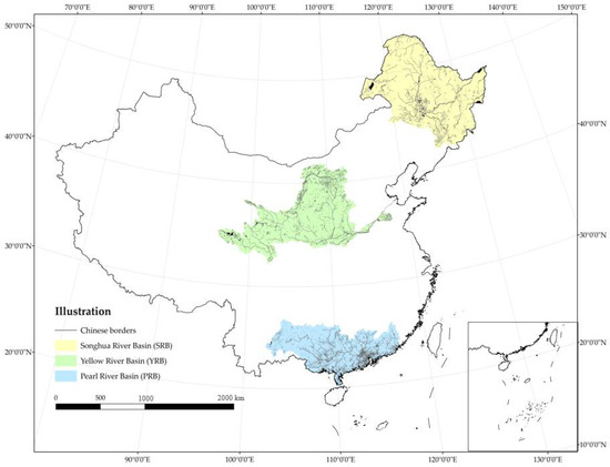 Three basins have been selected from the ten major water resource zones in China, north to south, based on different natural and social conditions. The distribution maps of rivers and lakes within the basins were extracted from the land use data, as shown in Figure 1. The basin zoning is based on the ten water resource zones in China. The yellow part indicates the SRB, the green part the YRB and the blue part the PRB. Three basins cover approximately 24% of China’s land area.