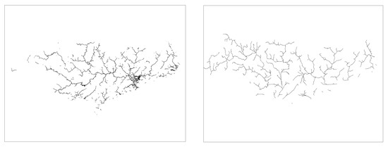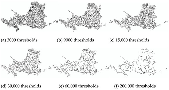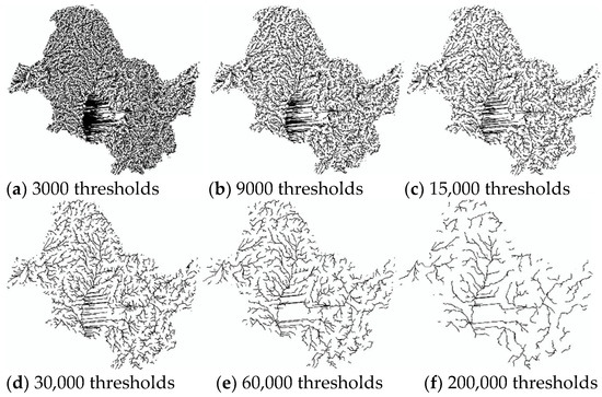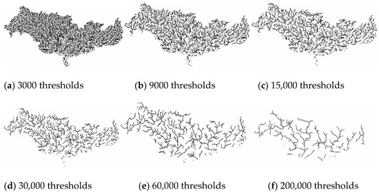 Based on literature searches and practical studies, it can be found that there is a multiplicative power function relationship between drainage accumulation thresholds and drainage density [49,50]. This relationship enables us to establish a quantitative relationship between the threshold and the drainage density. In order to be able to visibly represent drainage density at different thresholds, six thresholds (3000, 9000, 15,000, 30,000, 60,000, 200,000) were chosen between 3000 and 200,000 thresholds (Figure 2 and Figure 3 and Figure 4). The drainage density for different thresholds for the length of the river network was calculated using Equation (1). The first order derivative of the power function relationship between the drainage accumulation threshold and the drainage density gives the rate of reduction in drainage density. Finally, combined with the river data in land use, an appropriate drainage density reduction rate was selected to determine the optimal drainage accumulation thresholds.