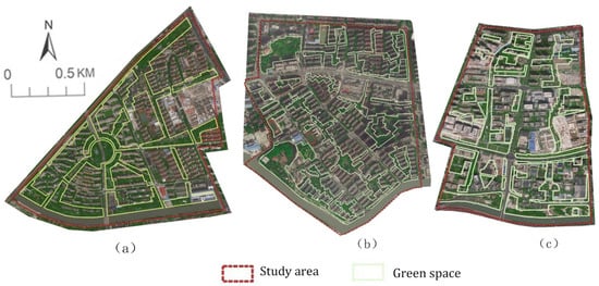 Satellite images and green space patterns of the three study areas in 2019: (a) block 1 (N1), (b) block 2 (N2) and (c) block 3 (N3).