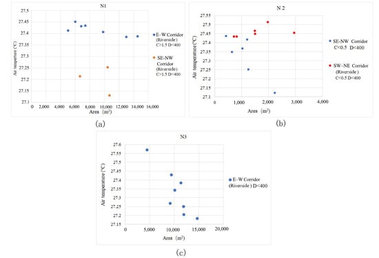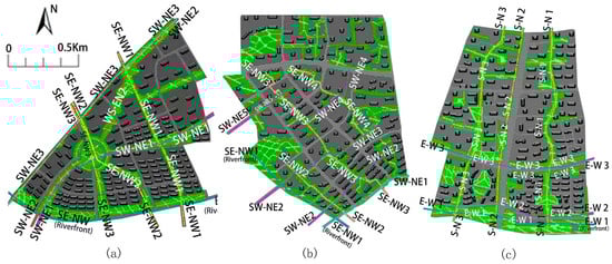 The green corridors with different orientations were identified and determined according to their integrity and importance in the study areas (Figure 3). Block N1 has multi-axial green corridors with a radiating pattern. There are riverside green corridors containing two orientations (E–W and SE–NW), three green corridors with an SW–NE orientation and three green corridors with an SE–NW orientation (Figure 3a). Block N2 has two vertically oriented green corridors, i.e., SE–NW and SW–NE orientations, interweaving to a typical green corridor pattern. It also has riverside green corridors with two orientations (SE–NW and SW–NE (Figure 3b)). In contrast, block N3 has three main green corridors with an S–N orientation, combined with an E–W riverside green corridor with a partial E–W orientation to form a dendritic green corridor pattern (Figure 3c). Among these types of corridor orientations, the SE–NW and S–N orientations have an angle of zero (or acute) during the summer monsoon, which is parallel to the prevailing summer wind (southeast wind).