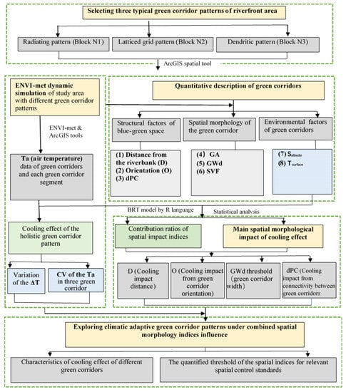 The framework of this study is shown in Figure 4. The study area contained three cases with different types of green space network patterns in riverfront urban blocks. The typical process for cooling effect studies involves four major steps: (1) Three-dimensional spatial model construction using the ENVI-met software and a microclimatic simulation. The spatial patterns were chosen based on satellite data combined with regulatory urban design data to identify the distribution of green corridors. The ENVI-met simulation results provided Ta values and the model physical spatial variables (Sky view factor (SVF), Tsurface and Albedo). (2) Quantitative description of green corridors. The climate-related spatial description variables were selected and calculated from three three aspects, namely, the structural factors of blue-green space, spatial morphology and environmental factors of green corridors. The network structure level to the individual spatial morphology factors (attribution data, spatial analysis, proximity analysis) by ArcGIS Guidos Toolbox, as well as to calculate the dPC index by Conefer 2.6 (by Santiago Saura and Josep Torné, at the Polytechnic University of Madrid and the University of Lleida, Spain). (3) BRT modelling analysis and statistical analysis of the results. Correlation determinations between the cooling effect and different types of spatial description variables were processed to obtain the contribution ratio of each factors’ impacts on the cooling effect. In addition, the detailed main individual spatial index affecting the Ta distribution under compound of multi-morphology factors. (4) Exploring climatic adaptive green corridor patterns under combined spatial morphology indices influence. For enhancing the cooling intensity of the blue-green corridor, the final step was clarified the differences in the cooling characteristics of different green corridors and explained the quantified threshold value of the spatial indices for relevant spatial control standards.