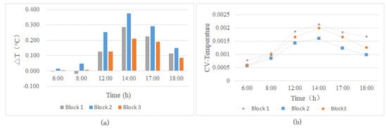 The coefficient of variation (CV) data of temperature in the internal region of green corridors was studied, which was used to reflect the dispersion of Ta values in each pattern of green corridors. Through the analysis of CV value changes of three green corridor patterns, it can be seen that the fluctuation variation effect of air temperature with the various spatial types of green corridors at the holistic block level. The formula for calculating coefficient of variation is as follows []: