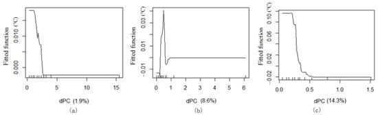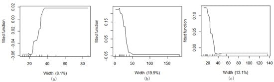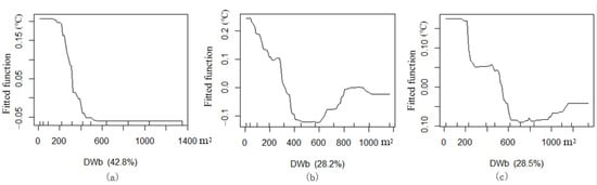 The BRT model was used to analyse ME changes of the multidimensional spatial factors of green corridors to the cooling effect in this study. Marginal effects are popular in some disciplines (e.g., economics), which refer to the new output or income by continuously increasing the input of a certain factor when other inputs are fixed []. In fact, marginal effect is a good illustration that output and input are not proportional; as long as the input exceeds a certain margin, output will disappear. The statistic calculated from the results of the existing fitting model, which represents the influence of the change of the independent variable on the change of the dependent variable. In this study, the marginal effect changes between each index and Ta can provide the impact threshold and correlation characteristics of each spatial morphological factor on air temperature by BRT model analysis.