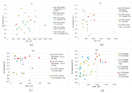 Scatter diagrams of green corridor segments with different D value grades and their corresponding Ta distributions. (a) In block N1, the distribution of Ta corresponding to green corridor D with the same WS–EN orientation indicates that when the dPC values of green corridors have the same grade, the values are more than 0.5 and the most corresponding T values in the low-temperature location belong to D values between 400 m and 750 m. (b) In block N1, with the same ES–WN orientation, the green corridor segments with a range of D from 400 m to 750 m also have the lowest Ta values. (c) In block N2, with the same ES–WN orientation, the D factor significantly affects the Ta distribution. When D is within 400 m, the cooling is attenuated with an increase in distance. When the D values of the green corridor segments are within 400–750 m grade with the same dPC and orientation, the internal Ta values in the green corridor segments are also the lowest. (d) In the green corridors of block N3 with an S–N orientation, the relationship between D and Ta still indicates the characteristic that the internal Ta value is low when D is within the 400–750 m grade.