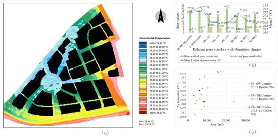 The impact of the width factor of the green corridor on the air temperature shows a regular pattern, i.e., the larger the corridor width, the lower the air temperature. When the width of the green corridors is 20–25 m, the ME of cooling is the largest. At 30–35 m, the overall ME of cooling is the highest and tends to be stable.