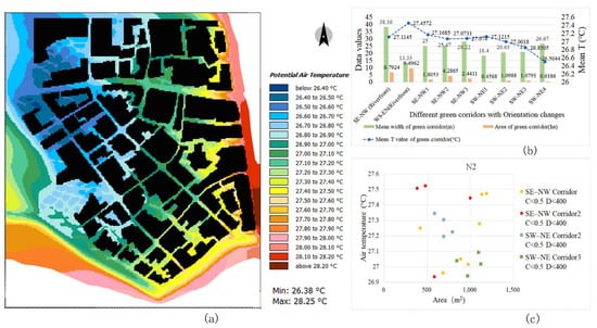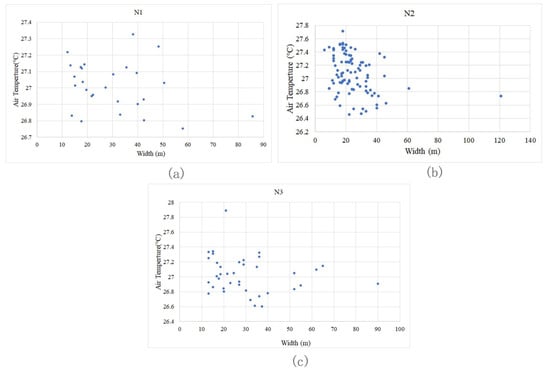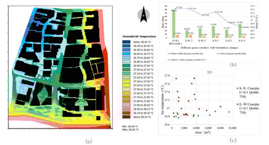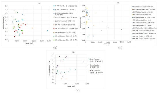 The variation coefficient (CV) was used to reflect the dispersion of Ta values in the green corridors in each study area (Figure 5b). Block N1 has green corridors in multiple directions, which are connected with the blue-green corridor in the south and can lead to a cold source airflow from the river surface. The connected green corridors are relatively wider and show large fluctuations in the CV of Ta. The green corridor with a large width exhibits the largest change in internal temperature at each time point. The cooling effect of block N2 is relatively stable. This green corridor pattern has the characteristics of good connectivity and the fluctuation of its internal Ta is the smallest. Block N3 comprises mostly the north–south corridors with a concentrated distribution and poor connectivity with the few east–west corridors. However, it has a relatively greater width (just larger than block N1) and its internal Ta fluctuation is better than that of block N2 and slightly lower than that of block N1.