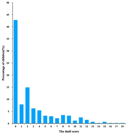 A total of 404 children completed this survey. Among the children in this study, 216 (65%) were boys. The mean dt score (±SD) was 2.8 ± 3.8. The distribution of dt score was positively skewed, with a skewness of 1.6 (Figure 1). Untreated ECC (dt > 0) was found in 231 (57%) children. Among those children with untreated ECC, 117 (29%) had 1 to 3 untreated caries teeth. The SiUC was 7.1. One child had the highest untreated ECC with 19 caries teeth. The Kappa value for intra-examiner agreement on untreated ECC diagnosis was 0.96.