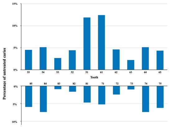 Our previous survey found that upper central incisors, followed by lower second molars and lower first molars, were the most common teeth affected by ECC []. In this survey, upper central incisors had the highest prevalence of untreated ECC. The lower first molars had a higher prevalence of untreated ECC than lower second molars, which is consistent with previous discoveries []. The reason could be that the first molars erupted earlier than the second molars. Lower incisors in general are less likely to develop ECC due to the proximity of the submandibular salivary gland’s opening and the tongue’s physical protection. A study reported that only 2% to 5% of lower incisors developed ECC []. However, this survey found approximately 10% of the lower central incisors had untreated ECC. Although lower incisors have a lower ECC risk than other teeth, children with multiple ECC could have had untreated ECC on their lower incisors. This survey found that most children (70%) who had untreated carious lower incisors had untreated ECC on other teeth.