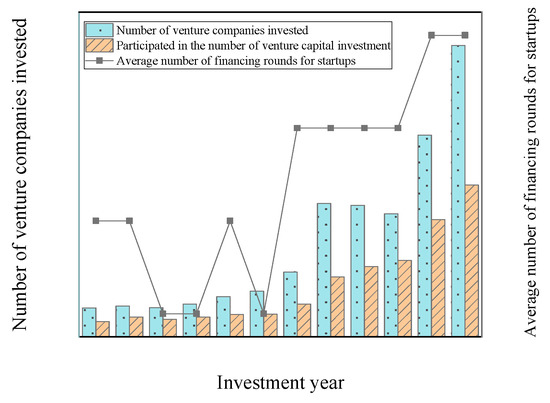 Research data mainly comes from the CV database (https://data.cvsource.com.cn/cn/login (accessed on 12 June 2015)). The database contains all venture capital transactions from 1989 to 2020, mainly involving investment institutions, investment information, investment amounts, transaction information, innovation and entrepreneurship information, and the overall evaluation level of the industry. Risk investment transaction events are accompanied by detailed data content [25]. The first day of IPO transactions and other financial information data of listed companies come from the CSMAR (https://us.gtadata.com/ (accessed on 12 June 2015)) database [26]. Figure 1 shows the risk investment information for some years. The data used in Figure 1 are corporate venture capital data from 2009 to 2020. The data source is the CV database (https://data.cvsource.com.cn/cn/login (accessed on 12 June 2015).). The research objects in Figure 1 are environmental-social enterprises and start-up companies.